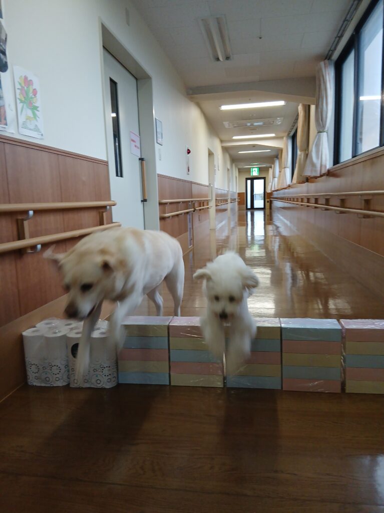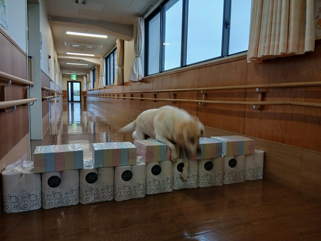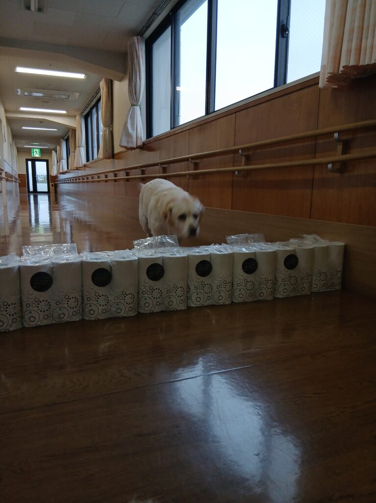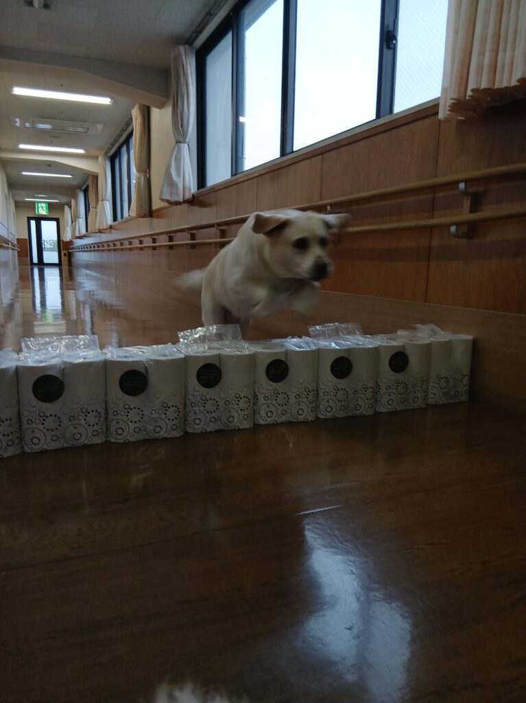 今日はクッキーちゃんとヴェリーちゃんと動画サイトで流行っているトイレットペーパーをジャンプするチャレンジをしてみようかと考えてくださった先輩職員さん