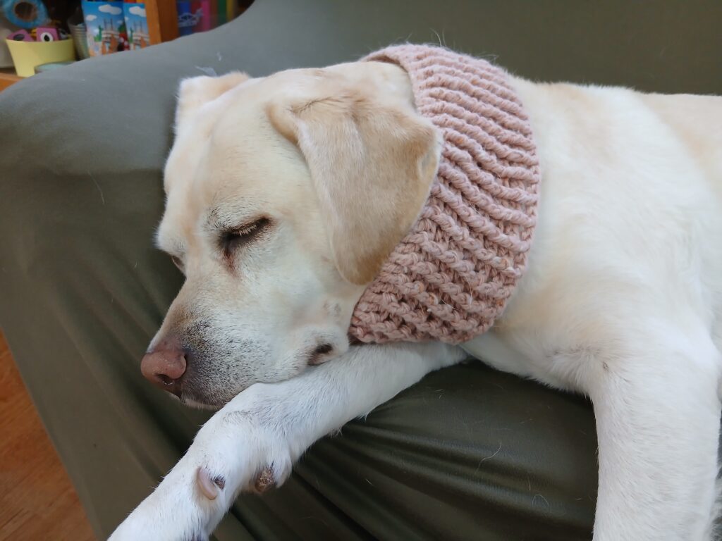この暖かそうな襟巻きは主任の手編みなのです😊