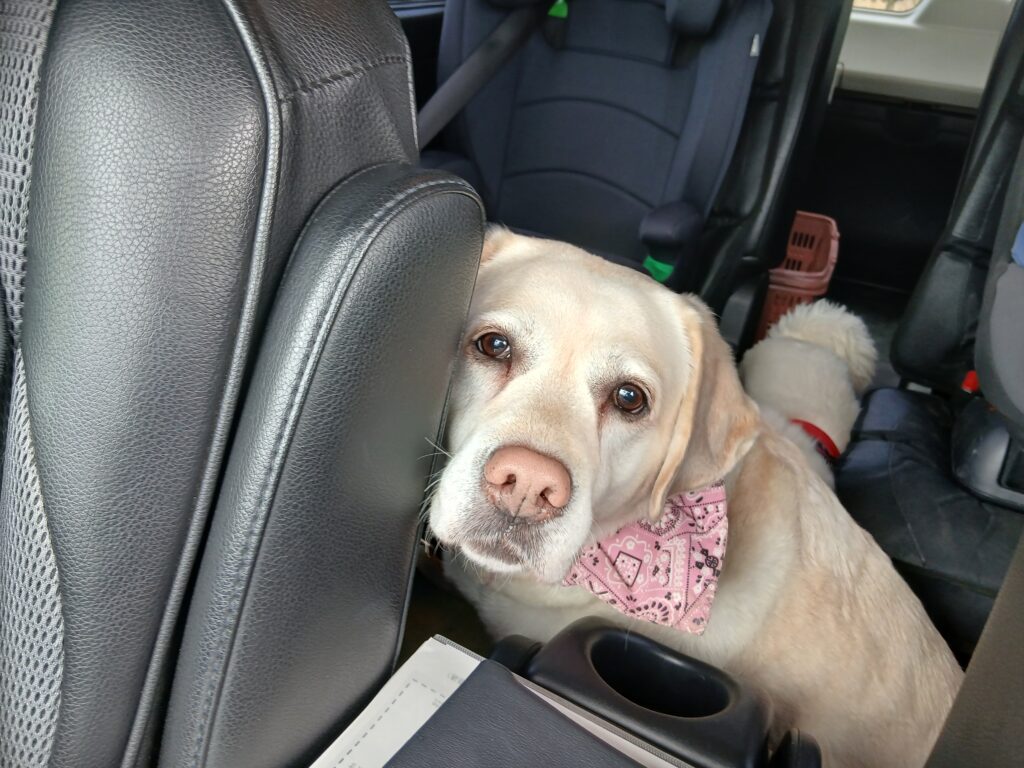 後ろのトランクルームから乗れずに座席の間に座っています